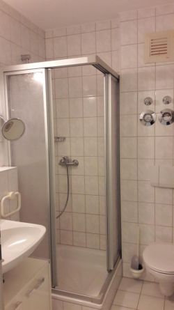 Badezimmer mit Dusche, WC, Waschbecken und Fön.