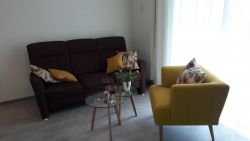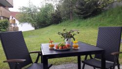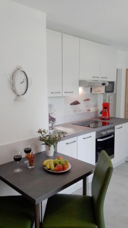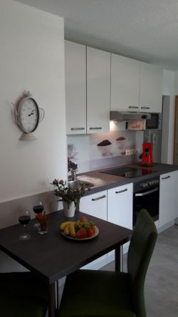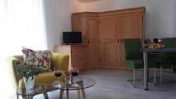 Die 1 1/2 Zimmer-Ferienwohnung 315 in Haus 3 ist mit 5***** Sternen klassifiziert und hat eine herrlichen Südterrasse, die vom Wohn-Essbereich aus begehbar ist. Der Flur ist mit eine Schuhschrank und einem Garderobenpanel ausgestattet. Der Wohn-/Essbereich ist mit einer Küchenzeile mit Kühlschrank mit Gefrierfach, Geschirrspülmaschine, Ceran-Kochfeld, Backofen, Mikrowelle, Wasserkocher, Toaster, Kaffeemaschine und Senseo-Kaffemaschine (Sie haben die Wahl!!), Eierkocher uvm., sowie Esstisch für 2 Personen, einer Couch, Sessel, Couchtisch, Kommode mit Kleiderschrank und Safe, sowie einem TV-Flachbildschirm ausgestattet.