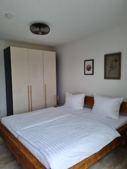 Separates Schlafzimmer mit Doppelbett und Schrank.