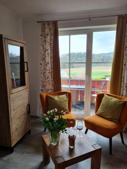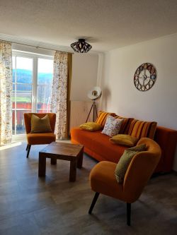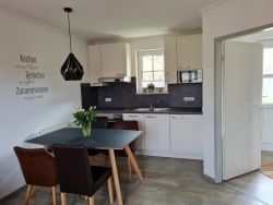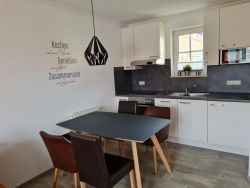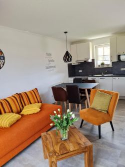 Der Wohn-/Essbereich ist mit einer Küchenzeile mit Kühlschrank mit Gefrierfach, Geschirrspülmaschine, Ceran-Kochfeld, Backofen, Mikrowelle, Wasserkocher, Toaster, Kaffeemaschine und Senseo-Kaffeemaschine, (Sie haben die Wahl) Eierkocher uvm. ausgestattet. Esstisch für 4 Personen, Boxspring-Couch mit Schlafgelegenheit für 1-2 Personen, 2 Sessel, Couchtisch, TV-High Board, Vitrine, Stehlampe, sowie einem großen TV-Flachbildschirm ausgestattet.