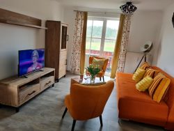 Die Zwei-Zimmer Ferienwohnung 518 in Haus 5 ist mit 5***** 5 Sterne klassifiziert und hat einen herrlichen Balkon, der vom Schlafzimmer und vom Wohnzimmer aus begehbar ist.