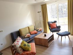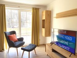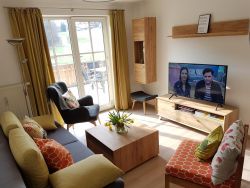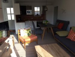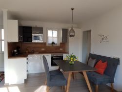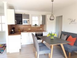 Der modern und geschmackvoll eingerichtete Wohn-Essbereich ist mit einer Küchenzeile (Geschirrspülmaschine, Backofen, Cerankochfeld, Kühlschrank und Gefrierfach, Mikrowelle, Wasserkocher, Toaster, Kaffeemaschine und Senseo-Kaffeemaschine (Sie haben die Wahl!!) uvm.), Esstisch für bis 5 Personen, Auszieh-Couch mit Schlafgelegenheit für 1-2 Personen, 2 modernen Sesseln, Couchtisch, TV-High-Board, sowie einem großen 49 Zoll TV-Flachbildschirm ausgestattet.