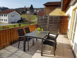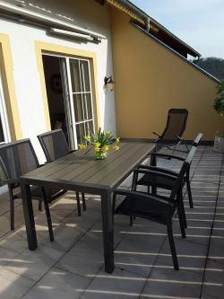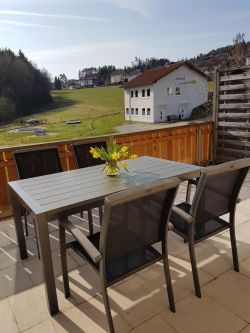 Ca. 20 qm großer Süd-Balkon: ausgestattet mit Gartenmöbeln für 5 Personen und Sonnenliege.