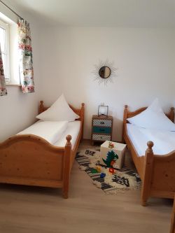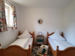 Schlafzimmer 2: mit zwei Einzelbetten und Schrank, Spielsachen und Bücher für Kinder.
